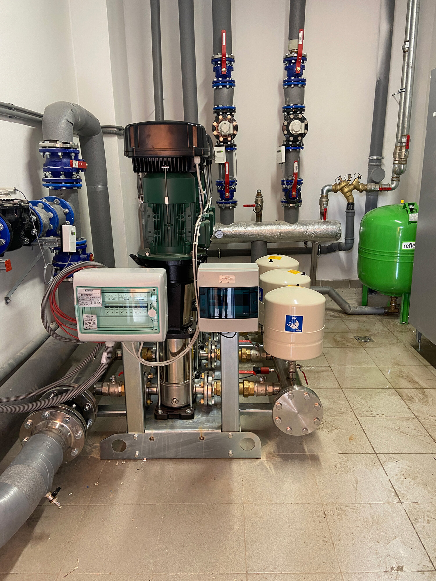 Použitý materiál: 3NKVE 20/5 S T E1 MCE 400-50 IE3 D.CONNECT Automatická tlaková stanica s frekvenčným meničom, DAB.3 ESYBOX MAX 60/120 T Automatická tlaková stanica s frekvenčným meničom, EVOPLUS obehové čerpadlá